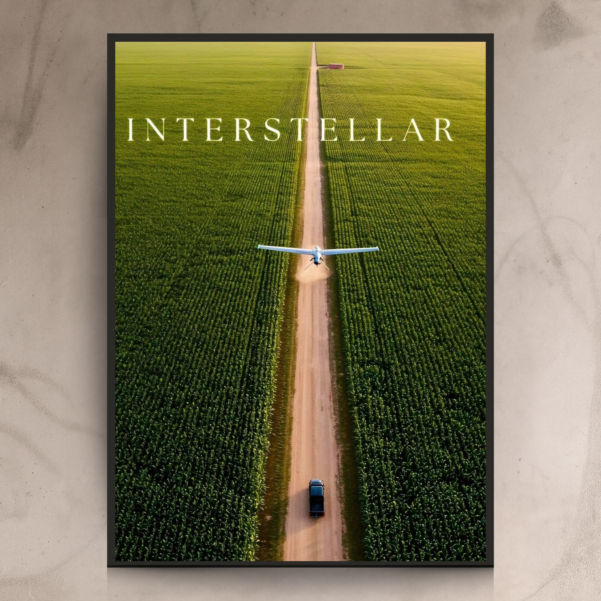 A cinematic wall frame inspired by Interstellar, showcasing a small plane flying above a long dirt road surrounded by endless green fields.